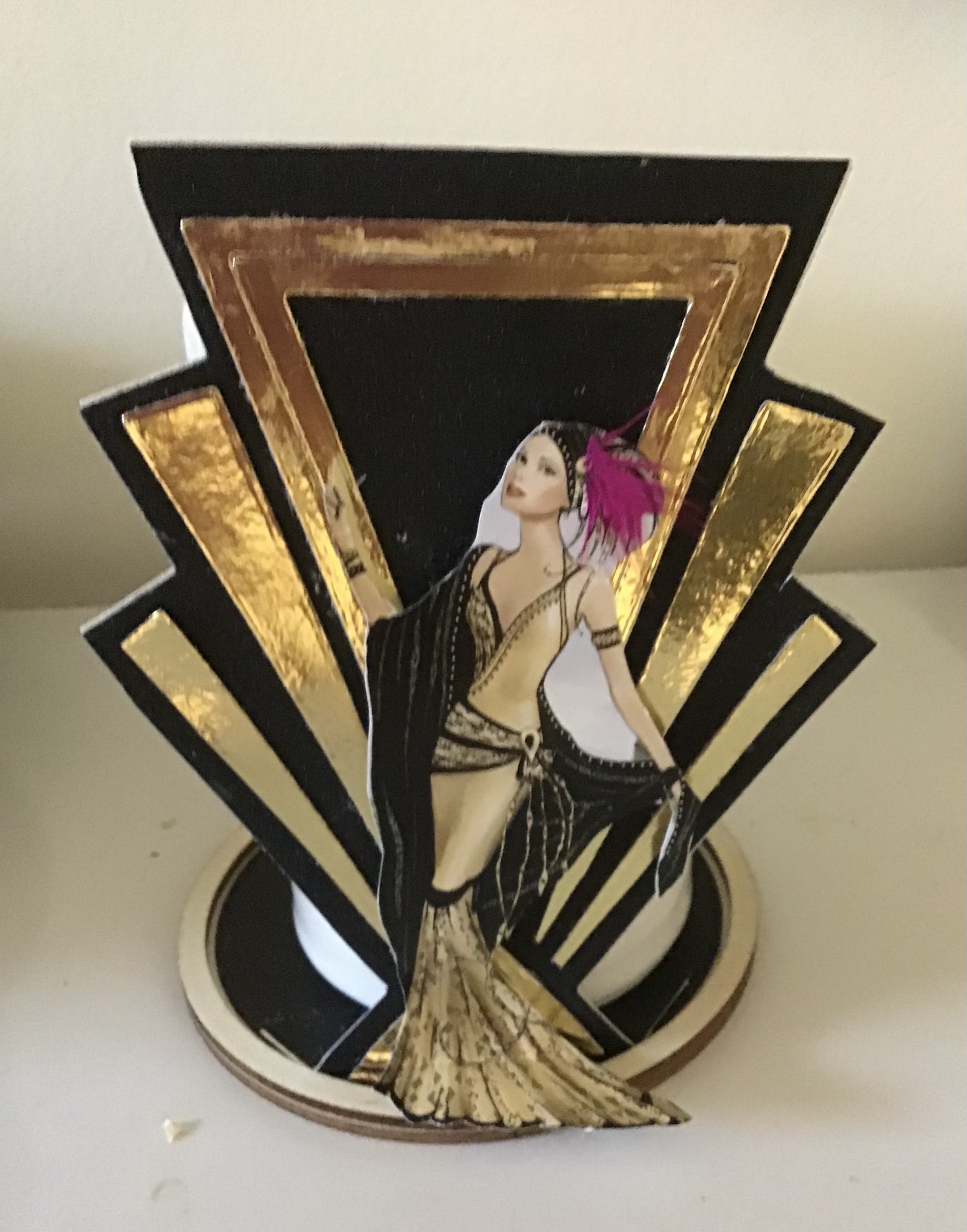 Make an Art deco coaster with print and paint. We will stamp an art deco image then paint and assemble it onto a coaster to use for cocktail, wine or water glass or for a candle.