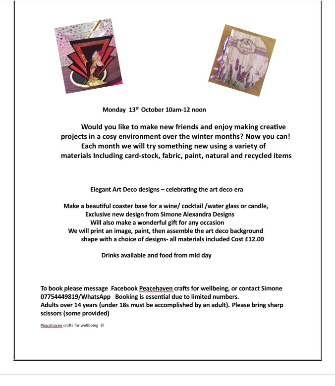 The workshops will be taught by Simone Howard, an adult education tutor for many years. Making something is very therapeutic and good for mental wellbeing, you can make items for yourself, family or friends and the skills you learn will stay with you for life. At the same time, you can enjoy yourself in a relaxed friendly environment and make new friends.